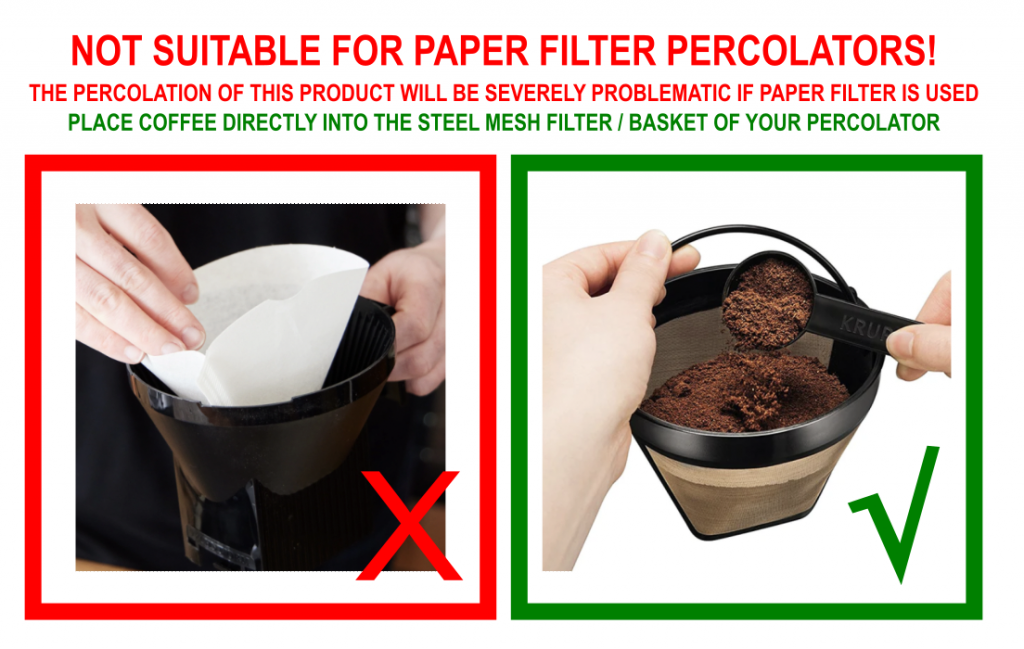 The infusion of this ground coffee with Belgian chocolate is achieved, by blending pure cocoa powder, creamer powder & a hint of sugar with the coffee granules. Due to the particle size difference (ground coffee vs powders), as well as the different ratio these two different kinds of particles become soluble in hot water, paper filter percolators are not to be used.